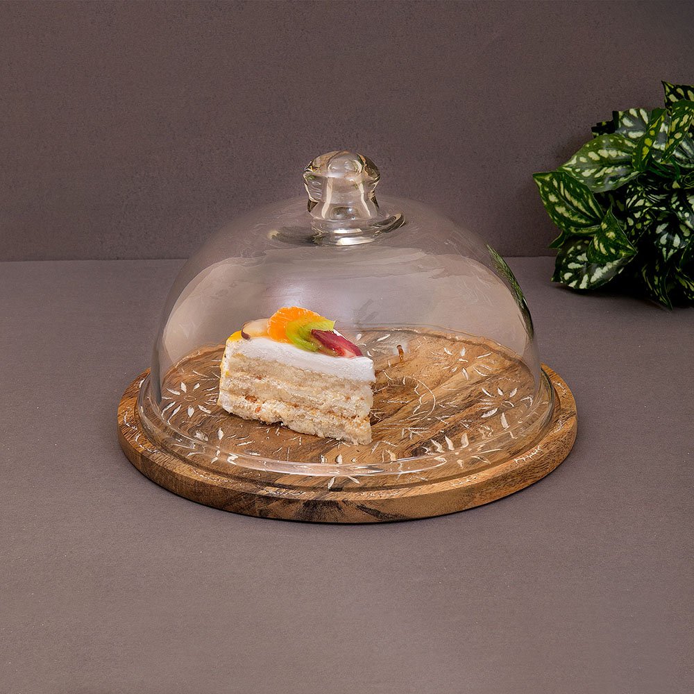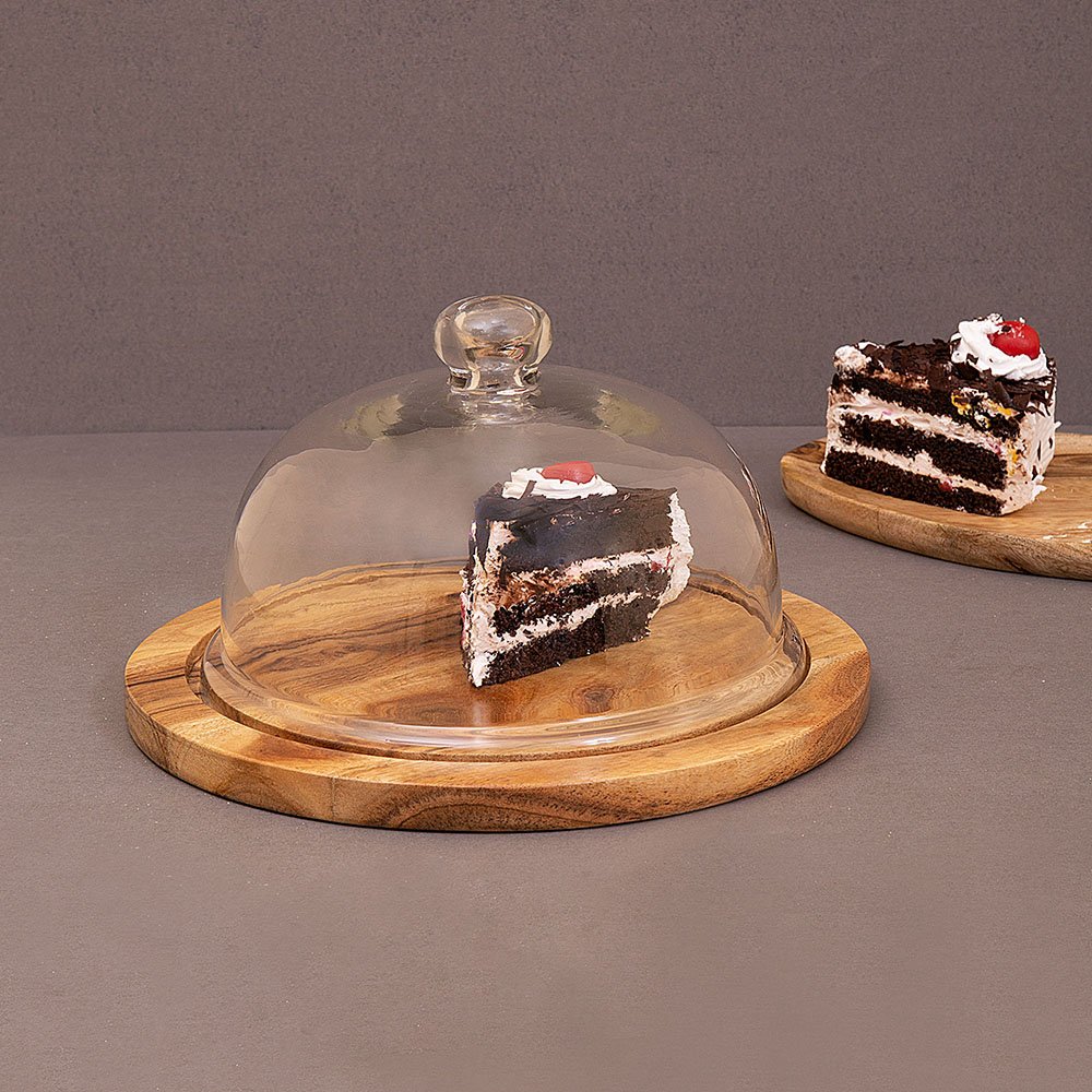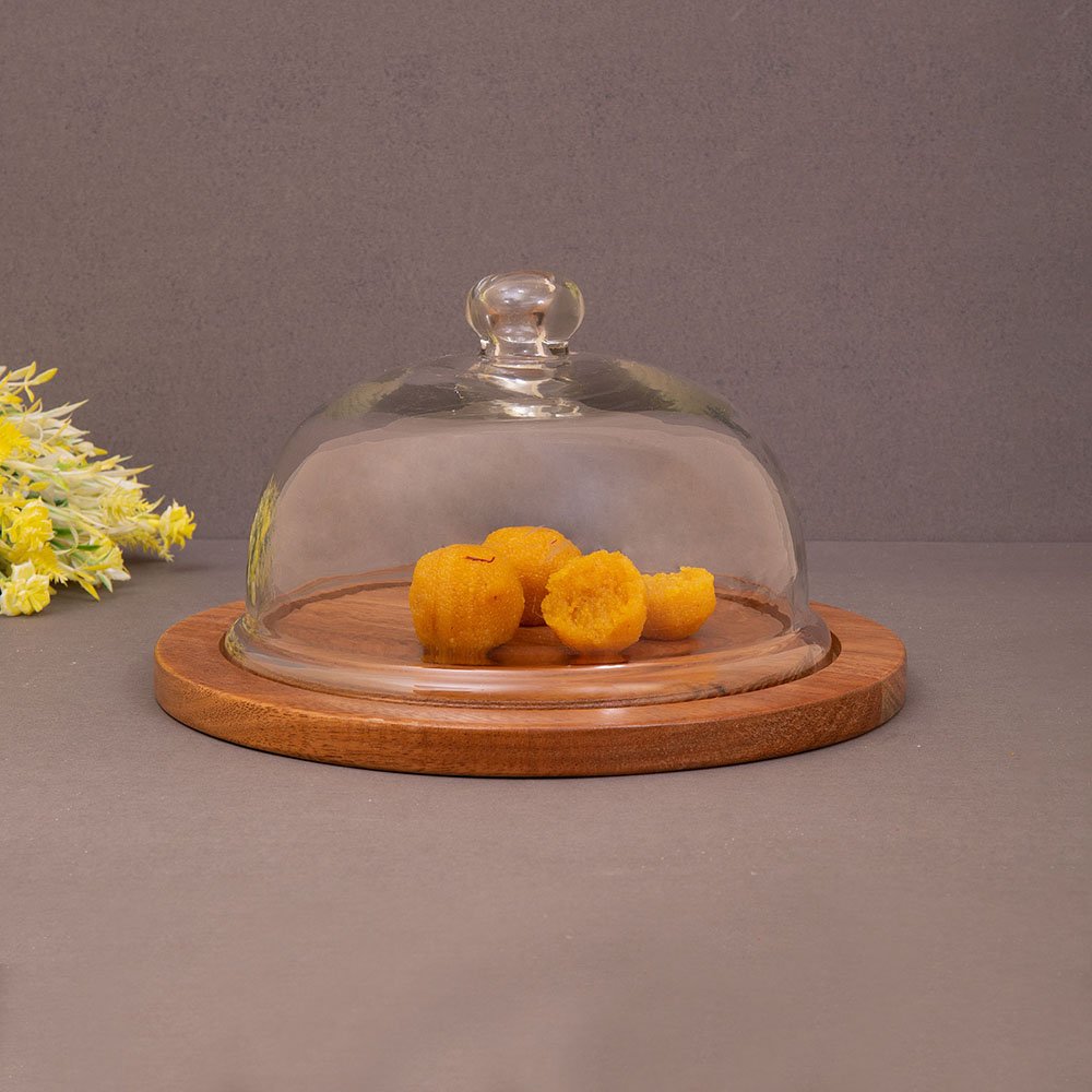 The sturdy wooden base provides a stable and durable platform, while the transparent glass dome helps keep your food fresh and protected from dust. Its classic combination of natural wood and clear glass makes it suitable for both modern and traditional settings.