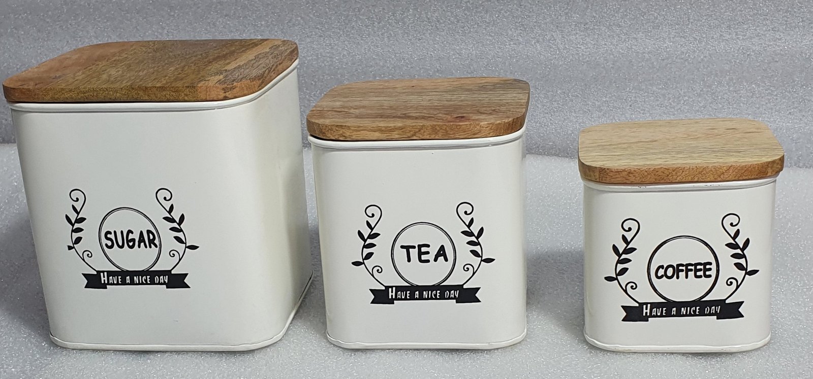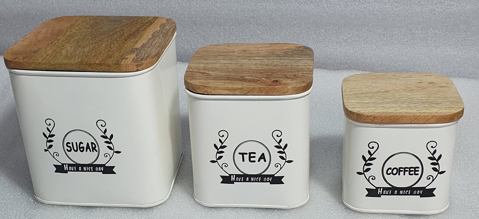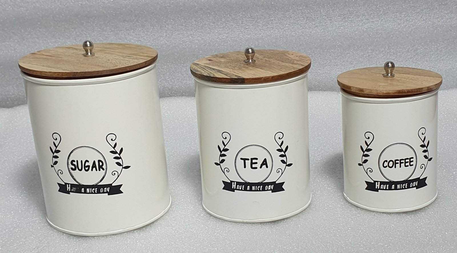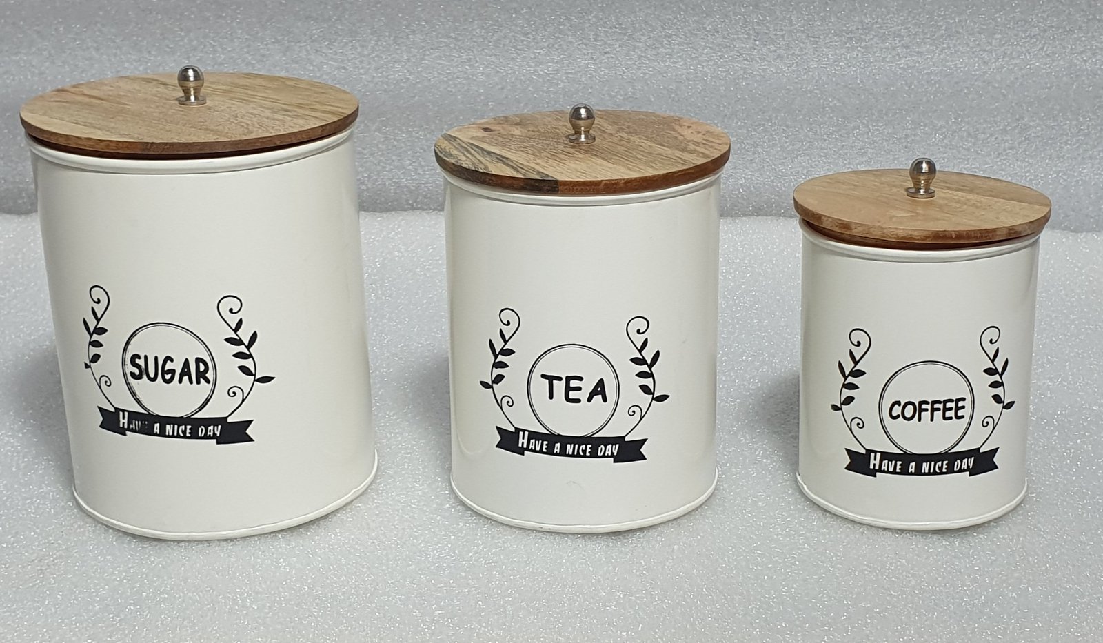 Stylish Tea, Coffee & Sugar storage canister set with wooden lids. Perfect for keeping your kitchen organized while adding a clean and modern look.