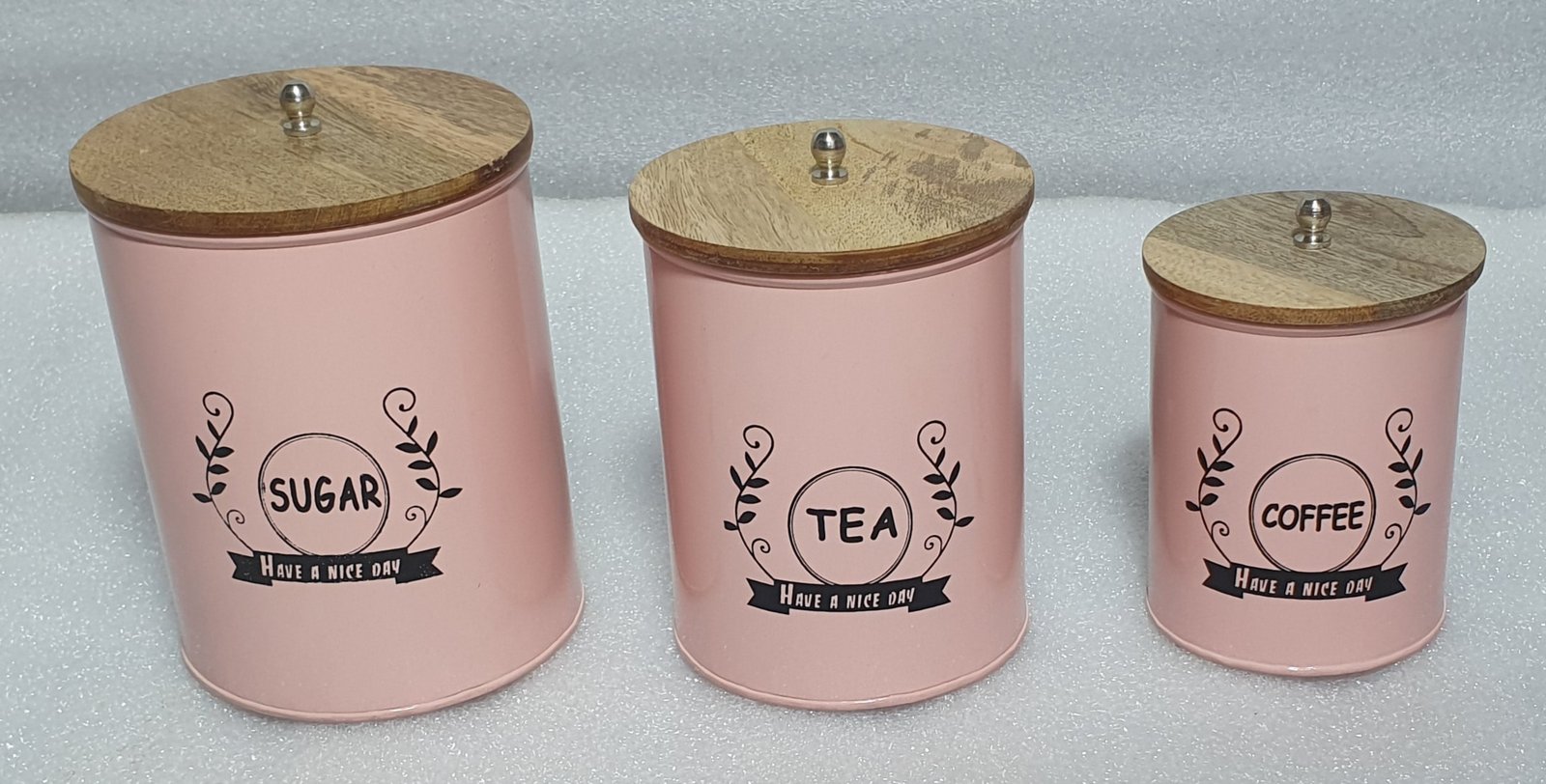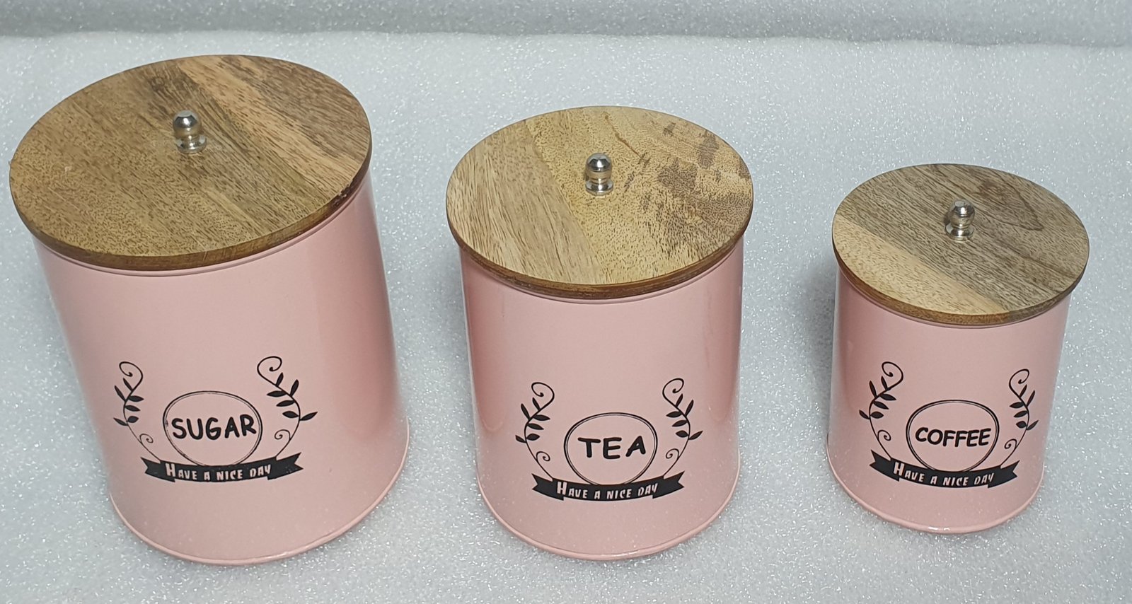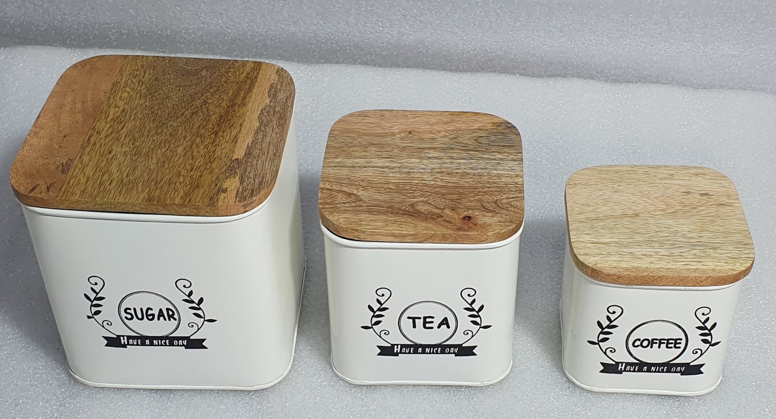 Stylish Tea, Coffee & Sugar storage canister set with wooden lids. Perfect for keeping your kitchen organized while adding a clean and modern look.